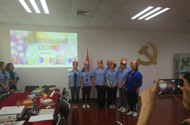 捐書活動后,第一黨支部為所有在第三季度過“政治生日”的7名黨員同志和過生辰生日的9名積極分子和群眾共同舉辦了一個“生日”祝福會,現場氣氛十分熱烈,所有過生日的同志都感動不已。第一黨支部為過“政治生日”黨員發放了生日禮物《習近平的七年知青歲月》,還特意為因身體原因不能現場參會的郭鶴同志錄制了“政治生日快樂,早日康復歸隊”的特別視頻。隨后,王秀麗同志帶領所有過“政治生日”的黨員面對黨旗進行了重溫入黨誓詞活動。
