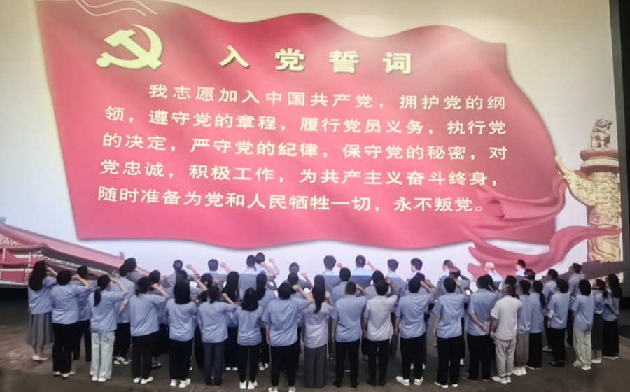 觀影結(jié)束后,在場的黨員、團員整齊列隊,面向鮮紅的黨旗,舉起右拳,在領(lǐng)誓人的帶領(lǐng)下莊嚴(yán)宣誓,既是對革命先輩的深切緬懷,也是對初心使命的鄭重承諾。每一位黨員都神情肅穆,在重溫誓詞的過程中,再次感悟入黨時的赤誠與堅定,更加明確身為黨員的責(zé)任與使命。